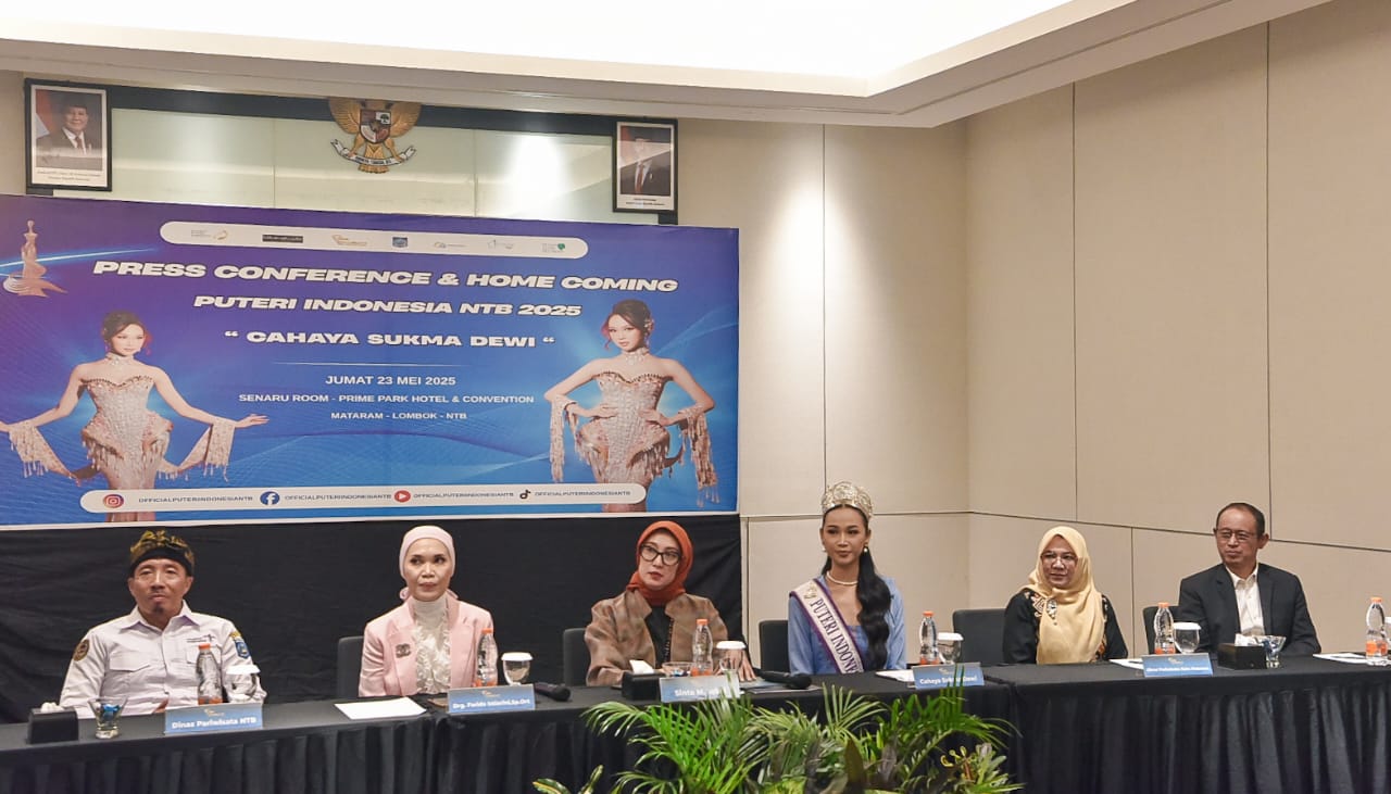 Ketua Dekranasda NTB, Sinta Agathia saat Press conference dan Home coming bersama Puteri Indonesia NTB Cahaya Sukma Dewi di Mataram (23/5/2025).