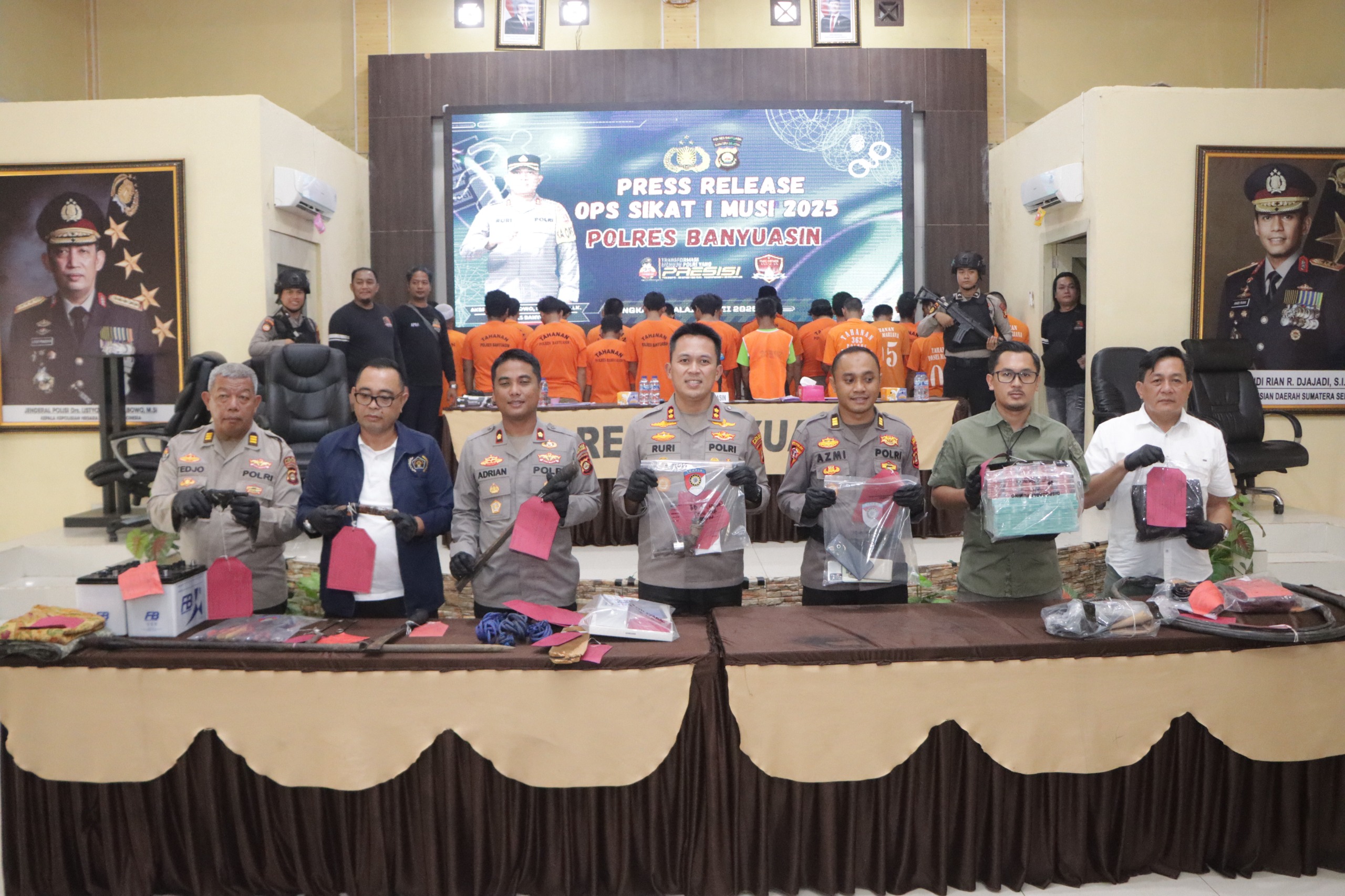 Banyuasin (Sumsel), utarapos.com – Polres Banyuasin Polda Sumsel berhasil mengungkap 56 kasus kriminal selama Operasi Sikat I Musi 2025. Capaian ini disampaikan langsung oleh Kapolres Banyuasin, AKBP Ruri Prastowo, dalam Press Release, Kamis (22/5/2025) Menariknya, angka tindak pidana periode Maret-April 2025 tercatat lebih rendah dibanding Januari-Februari, menunjukkan efektivitas upaya pencegahan dan penindakan.