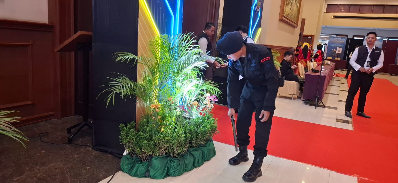 Komandan Satuan (Dansat) Brimob Polda NTB, Kombes Pol. Dwi Yanto Nugroho, S.I.K., M.Han., dalam keterangannya saat dikonfirmasi di lokasi acara menerangkan bahwa sejak pagi, pihaknya dari Detasemen Gegana telah melakukan upaya sterilisasi total di seluruh area hotel, mulai dari ruang utama hingga area parkir.“Sterilisasi ini kita lakukan untuk mengantisipasi segala potensi gangguan atau ancaman yang bisa dapat menghambat kelancaran jalannya acara kenegaraan ini,” tutur Kombes Pol. Dwi Yanto.