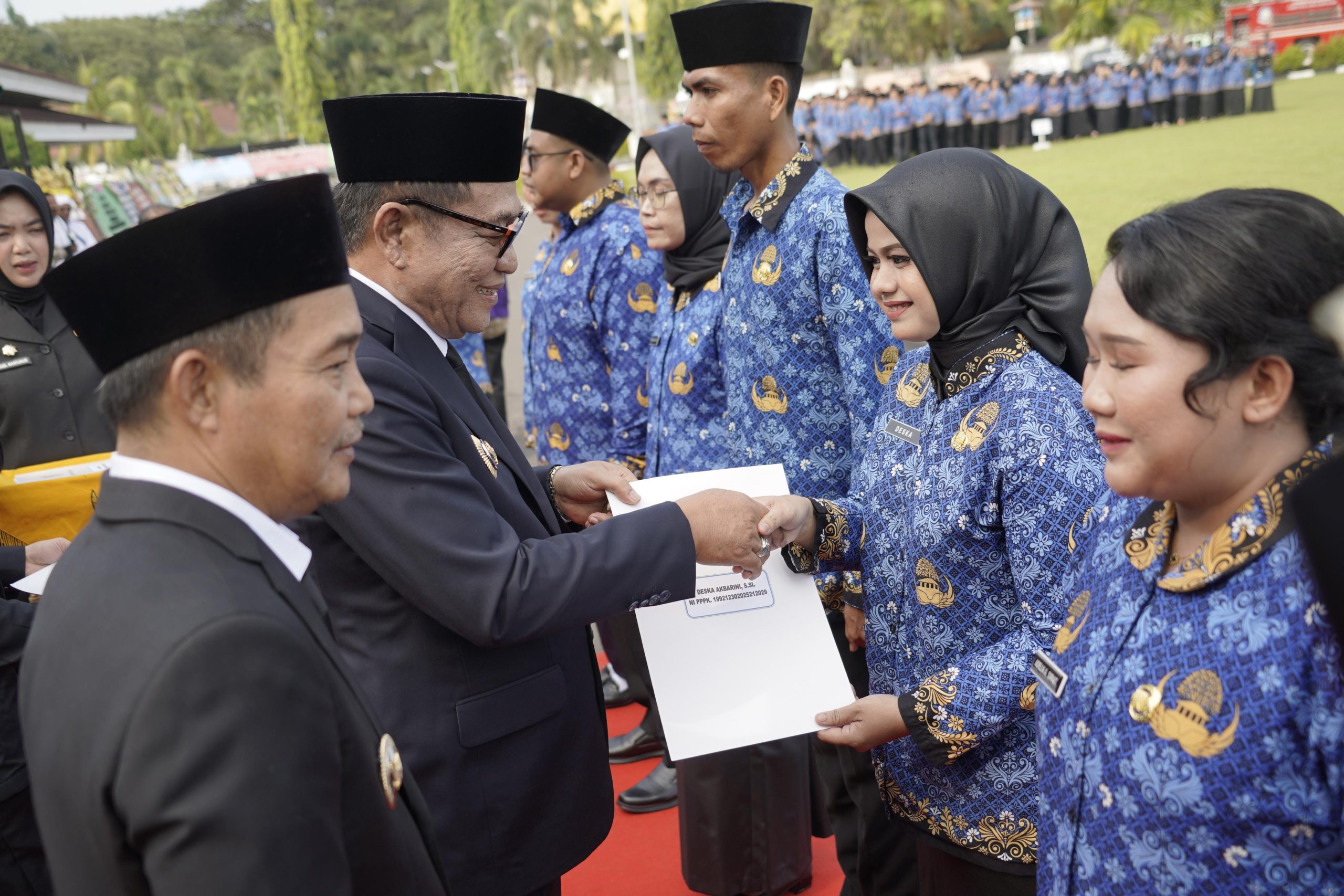 Bupati Muba HM Toha SH menyerahkan SK pengangkatan PPPK dan CPNS di Halaman Griya Bumi Serasan Sekate Rumah Dinas Bupati Muba. Kamis (5/6/2025)