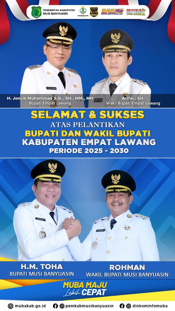 Musi Banyuasin (Sumsel), Utarapos.com – Bupati Musi Banyuasin HM Toha bersama Wabup Rohman menyampaika ucapan selamat atas dilantiknya Bupati Empat Lawa periode 2025-2030 Joncik Muhammad-Arifa’i oleh Gubernur Sumatera Selatan H Herman Deru (HD) di Griya Agung Senin (16/6/2025)
