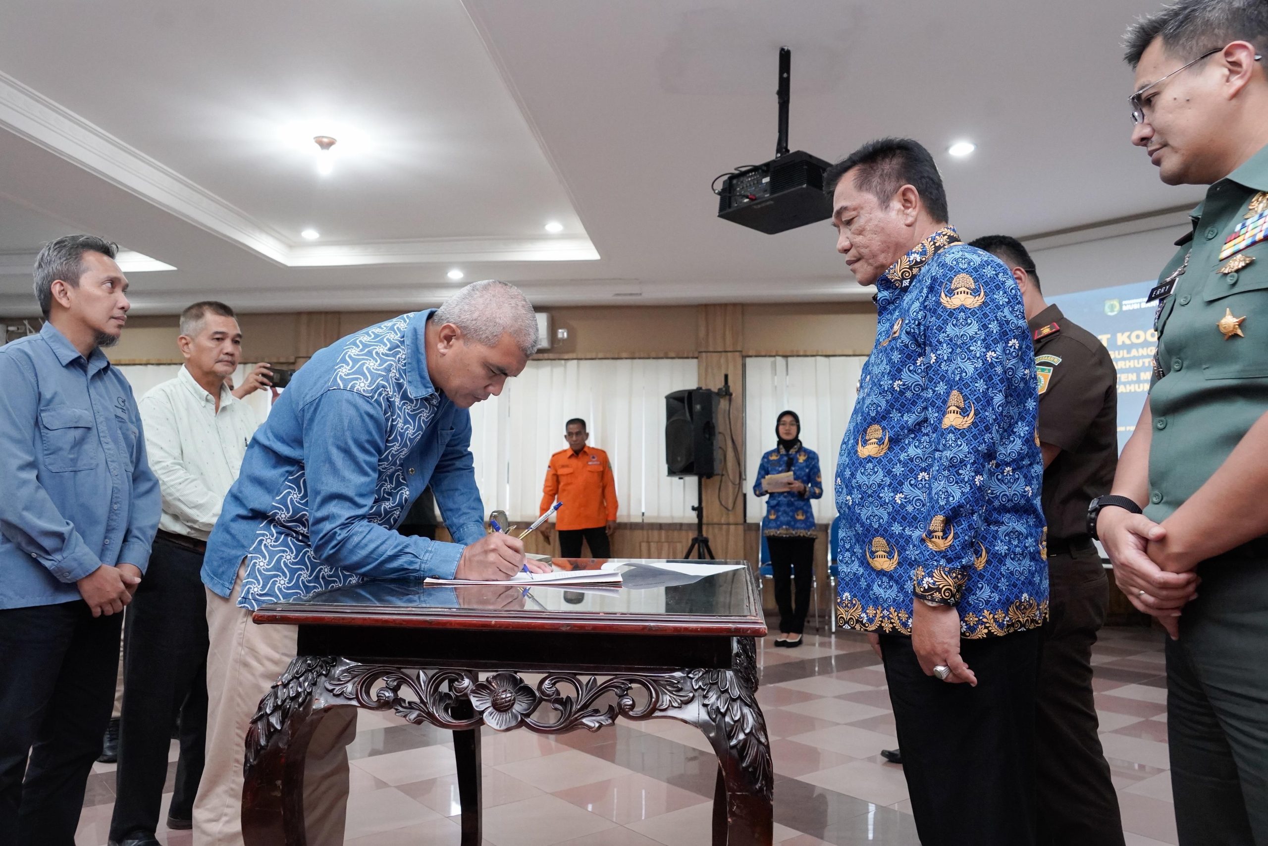 Penandatanganan komitmen perusahaan dalam rangka mendukung program pemerintah daerah terkait penanggulangan bencana Karhutbunlah rangkaian dari Rakor Penanggulangan Bencana Kebakaran Hutan, Kebun, dan Lahan (Karhutbunlah) Tahun 2025 disaksikan Bupati HM Toha, Dandim 0401/Muba, Letkol Inf Erry Dwianto SPsi MHan Selasa (17/6/2025).