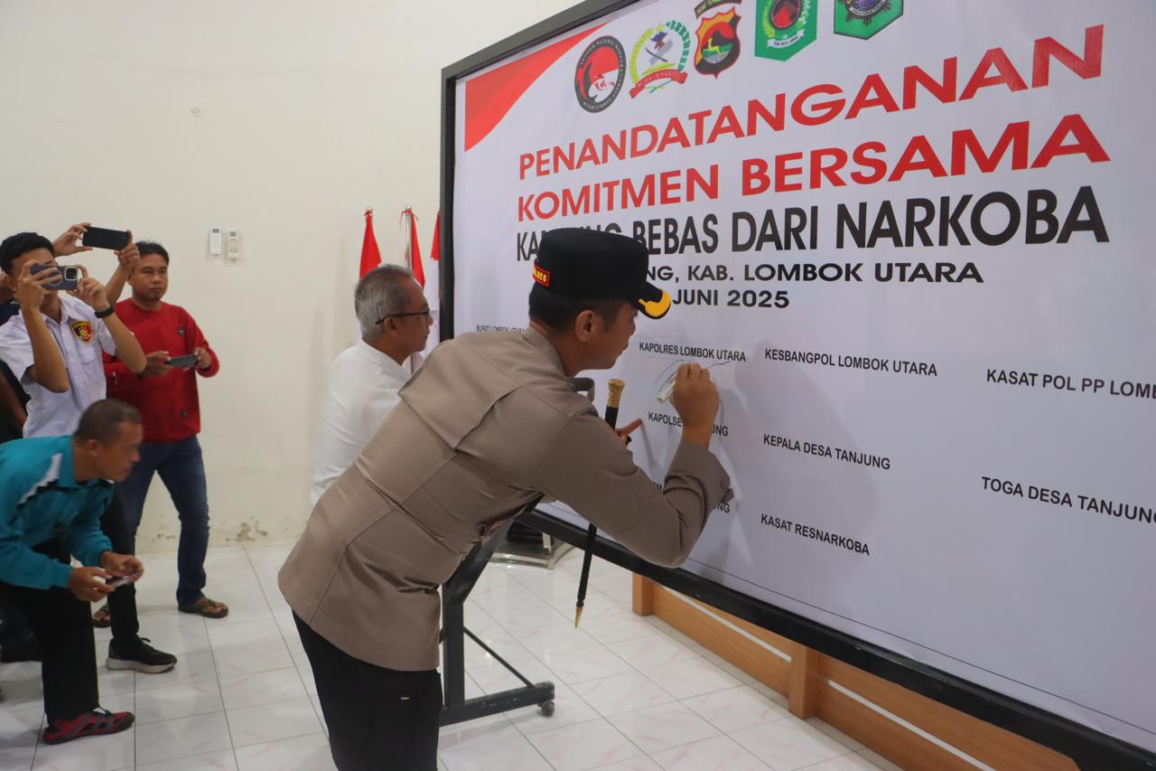 Kapolres Lombok Utara AKBP Agus Purwanta SIK tandatangani komitmen bersama kampung Bebas dari Narkoba Desa Tanjung bertempat di aula kantor Desa Tanjung (20/6/2025)