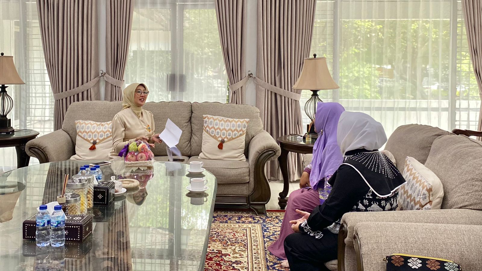 Ketua Dekranasda Provinsi NTB Sinta Agathia Soedjoko saat menerima perwakilan Salimah NTB dan Sri Lestari selaku owner Riles Lestary di Pendopo Gubernur. Selasa (1/7/2025)