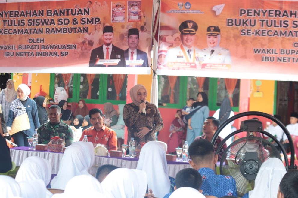 Wujudkan Banyuasin Cerdas, Wabup Netta Serahkan Bantuan Buku Tulis Siswa SD dan SMP Se-Kecamatan Rambutan