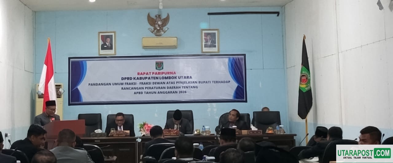 Lombok Utara, (NTB) Utarapost.com – Sidang Paripurna DPRD Kabupaten Lombok Utara digelar untuk membahas jawaban dari fraksi-fraksi dewan terkait Rancangan Anggaran Pendapatan dan Belanja Daerah (APBD) Tahun Anggaran 2026, pada Selasa (4/11/2025. Sidang ini dipimpin oleh Ketua DPRD Lombok Utara, Agus Jasmani, dan dihadiri oleh Wakil Ketua I Made Kariyasa serta Wakil Bupati Lombok Utara beserta seluruh Organisasi Perangkat Daerah (OPD) terkait.