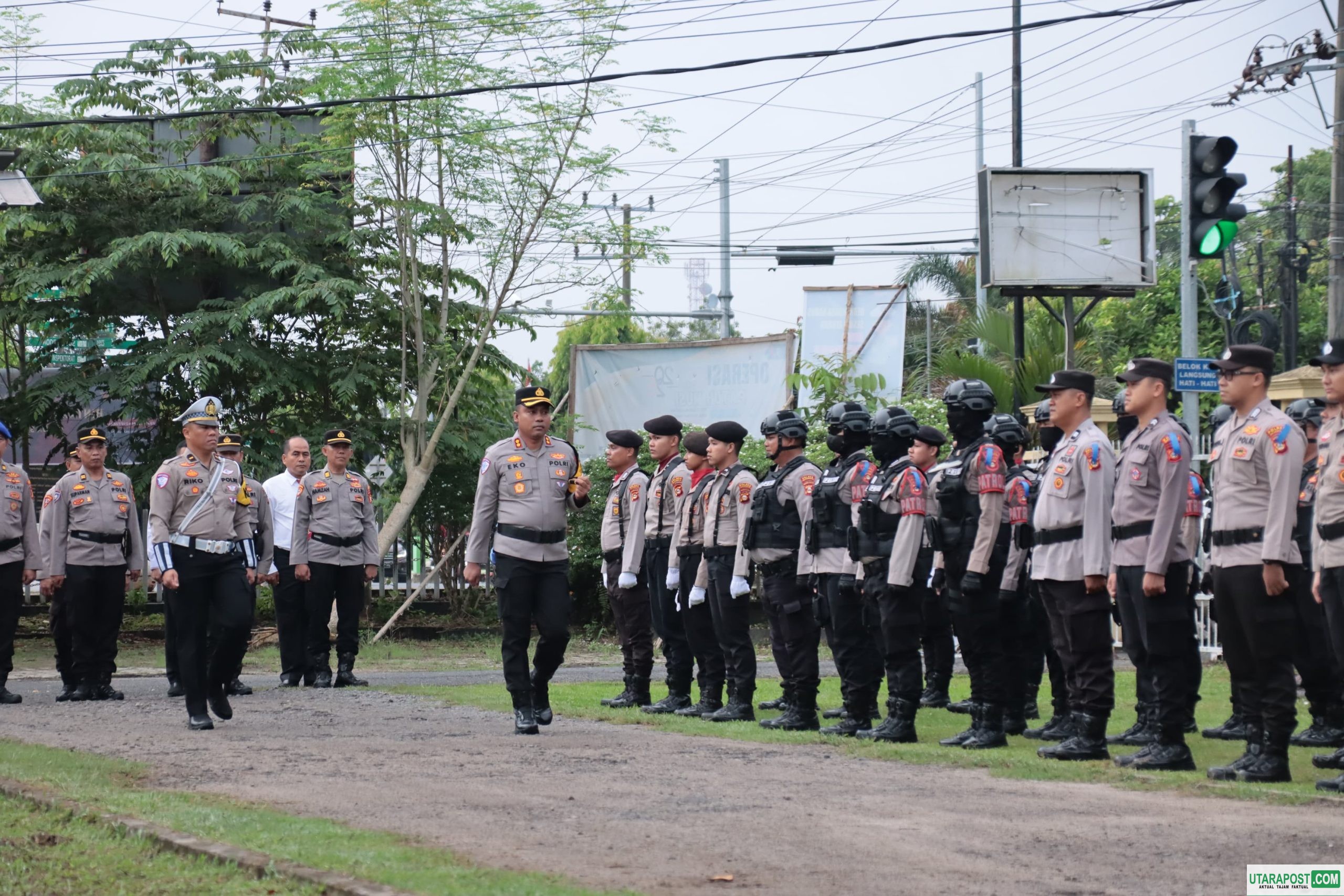 Pemeriksaan pasukan oleh Kapolres OKI, AKBP Eko Rubiyanto pada Apel Gelar Pasukan Operasi Zebra Musi 2025 yang digelar di halaman Mapolsek Kayuagung, Senin (17/11/25).