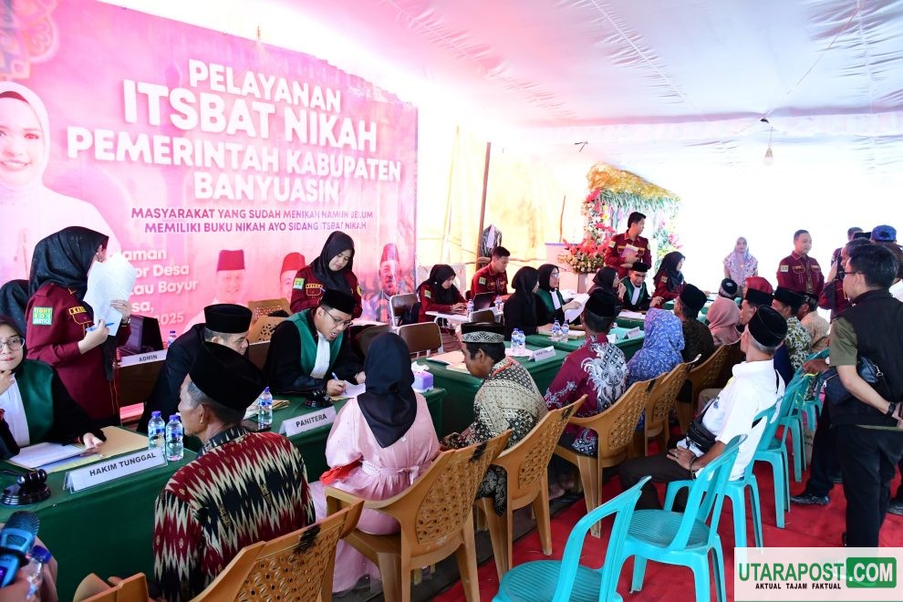 Banyuasin (Sumsel), utarapos.com – Pemerintah Kabupaten (Pemkab) Banyuasin kembali melaksanakan Sidang Isbat Nikah Tahun 2025 yang dipusatkan di Halaman Kantor Desa Rantau Bayur, Kecamatan Rantau Bayur, Selasa (18/11/2025). Kegiatan ini secara resmi dibuka oleh Bupati Banyuasin, Dr. H. Askolani, S.H., M.H., dengan dihadiri berbagai unsur Forkopimda dan jajaran Pemerintah Daerah.