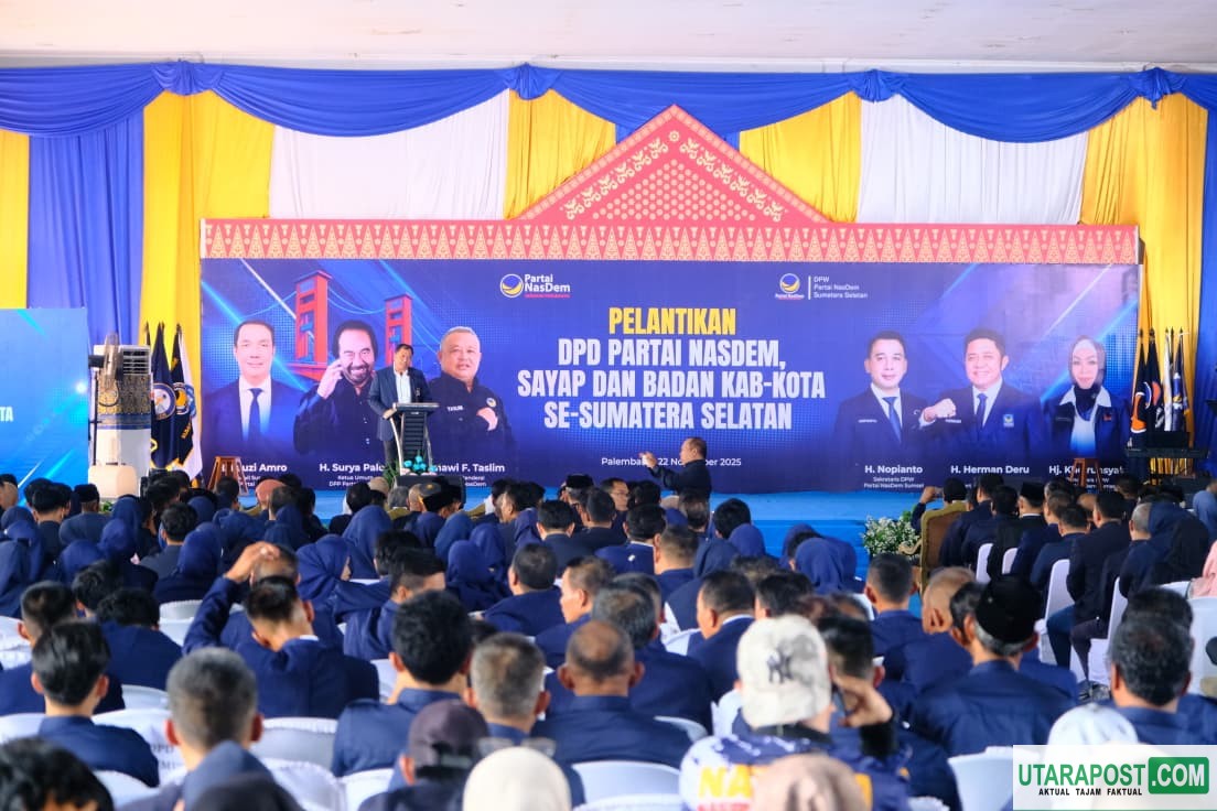 Palembang (Sumsel), utarapos.com – Bupati Muba HM Toha Tohet SH yang juga Ketua DPD Partai NasDem Muba menghadiri langsung Pelantikan 14 Dewan Pimpinan Daerah (DPD) Partai NasDem Se-Sumatera Selatan di Kantor Dewan Pimpinan Wilayah (DPW) Partai NasDem Sumatera Selatan di Palembang, Sabtu (22/11/2025).