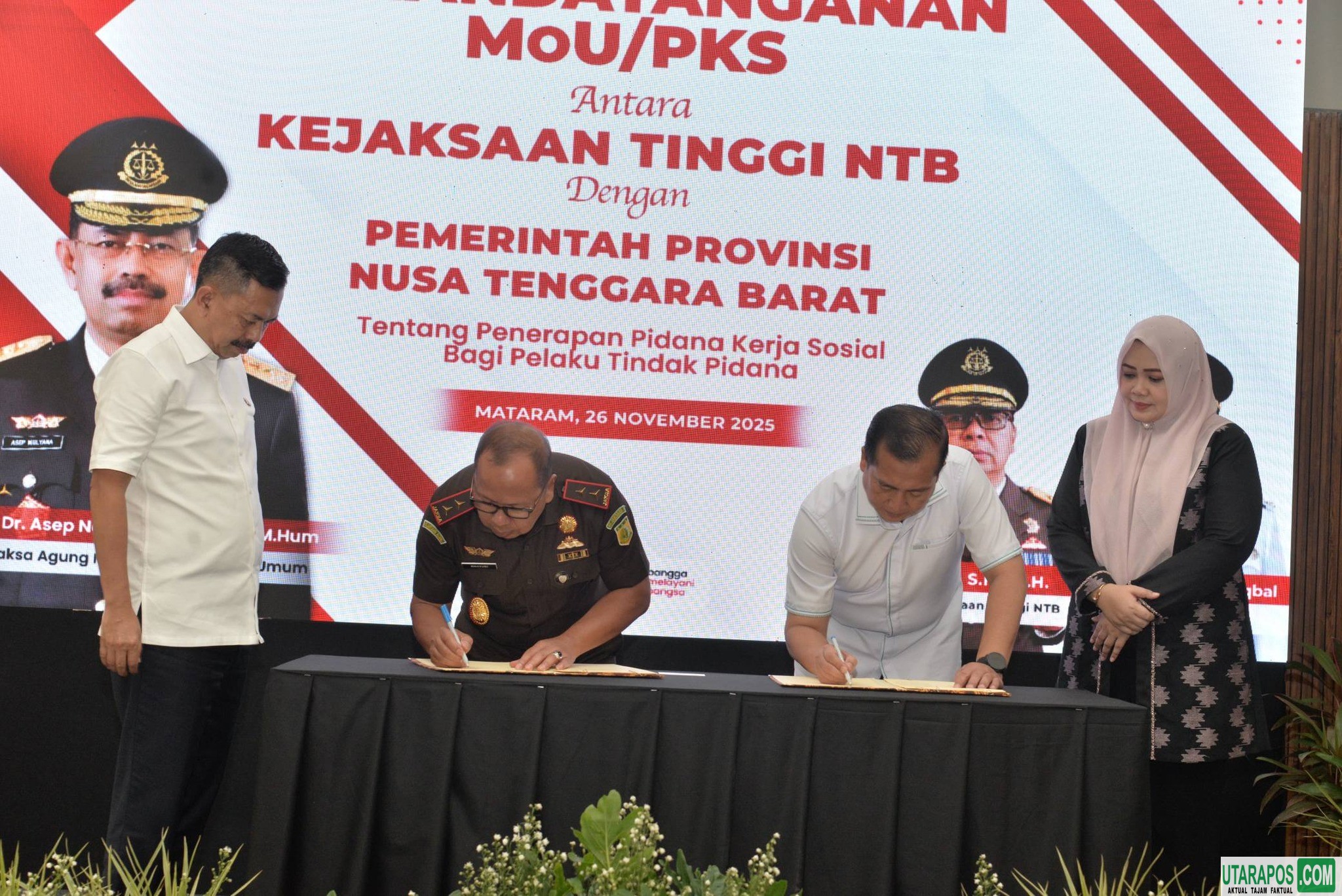 Mataram (NTB), utarapos.com – Pemerintah Provinsi NTB bersama pemerintah kabupaten/kota se-NTB dan Kejaksaan Tinggi NTB menandatangani Memorandum of Understanding (MoU) atau Perjanjian Kerja Sama (PKS) tentang penerapan pidana kerja sosial bagi pelaku tindak pidana. Penandatanganan berlangsung di Pendopo Gubernur NTB, Rabu (26/11/2025), sebagai langkah awal menjelang implementasi Undang-Undang Nomor 1 Tahun 2023 tentang KUHP yang akan berlaku penuh pada 2026.