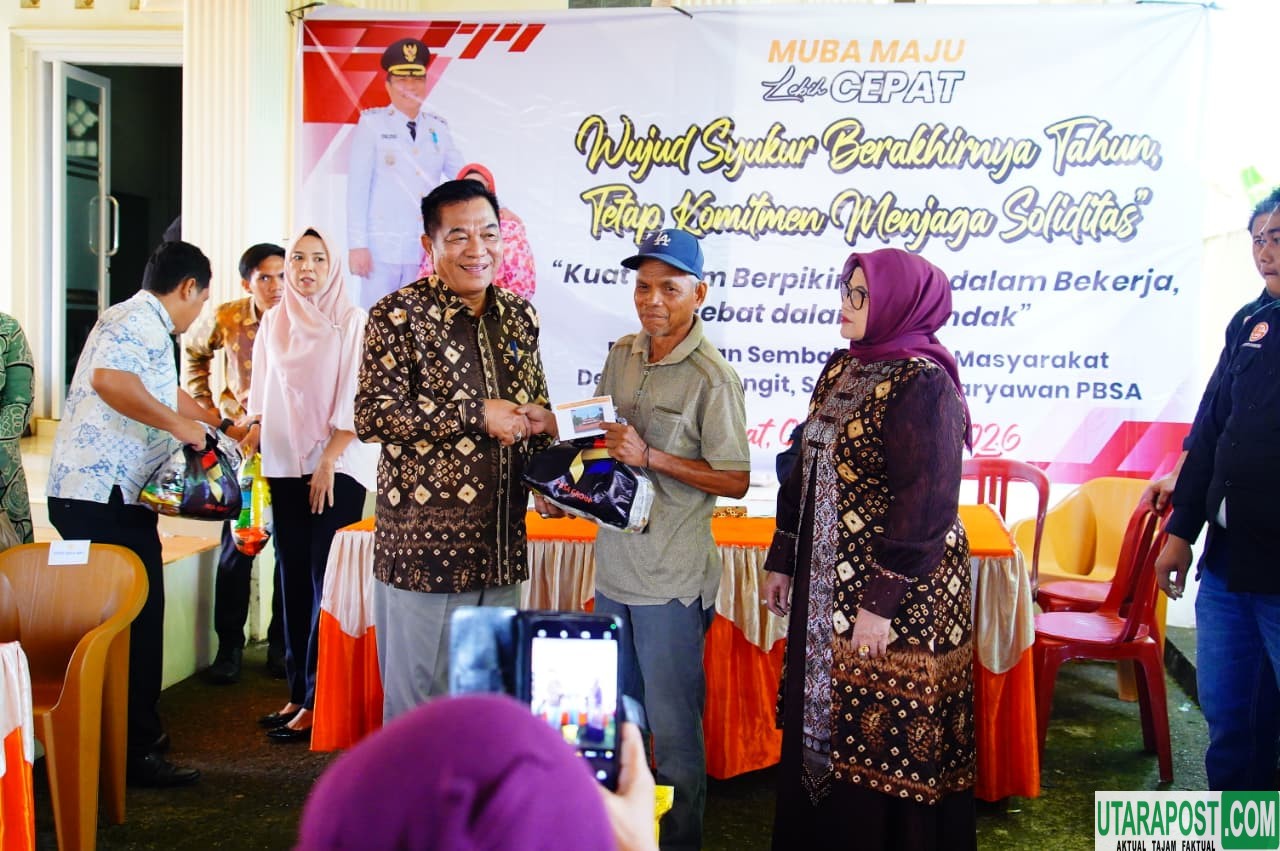 Musi Banyuasin (Sumsel), utarapos.com — Bupati Musi Banyuasin (Muba) H M Toha Tohet SH berbagi kebahagiaan dengan masyarakat Desa Sungai Angit, Kecamatan Babat Toman, Jumat (2/1/2026).