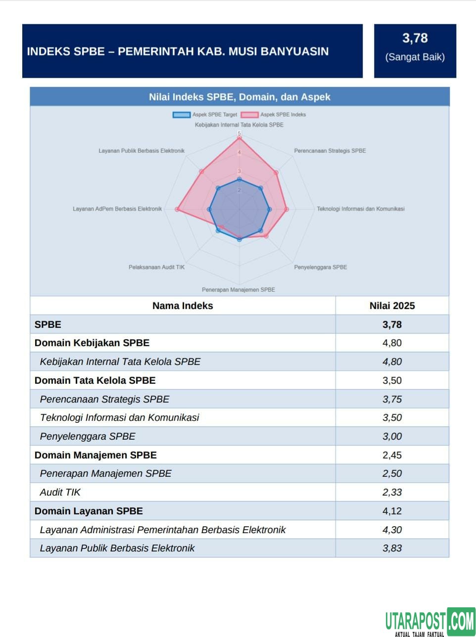 Setelah sebelumnya mendapatkan nilai tertinggi di Sumatera Selatan pada Indeks Satu Data Indonesia (ISDI). Kominfo Muba kembali meraih prestasi, Kali ini nilai Sistem Pemerintahan Berbasis Elektronik (SPBE) di Kabupaten Muba mengalami peningkatan yang signifikan, dari 3,62 menjadi 3,78 dengan predikat SANGAT BAIK di tahun 2025.