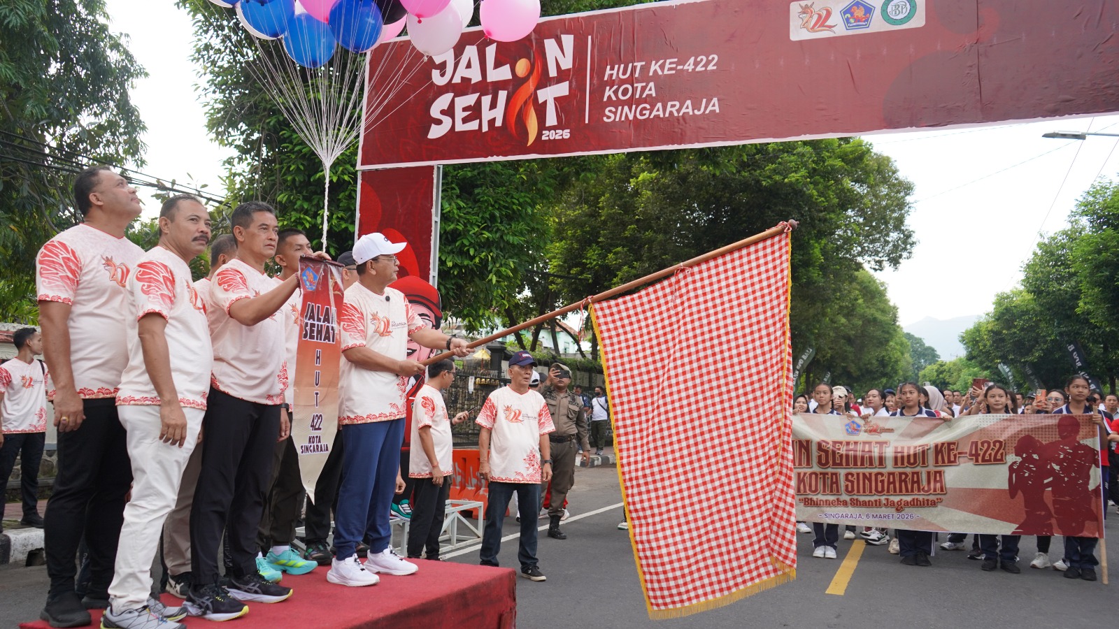 Selanjutnya, Bupati Sutjidra bersama Wabup Supriatna didampingi Ketua DPRD Buleleng beserta jajaran Forkopimda Buleleng melepas jalan sehat yang ditandai dengan pengibaran bendera dan pelepasan balon udara.